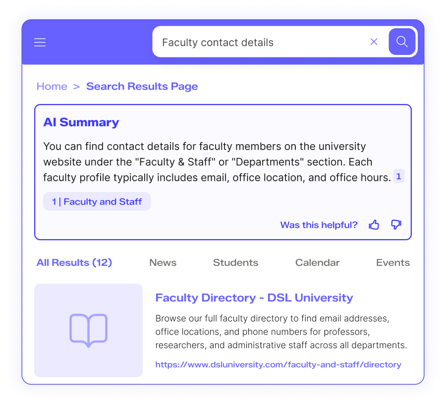 AI Summary reads and synthesizes your indexed content in real time and displays a brief, accurate summary directly above the traditional search results.