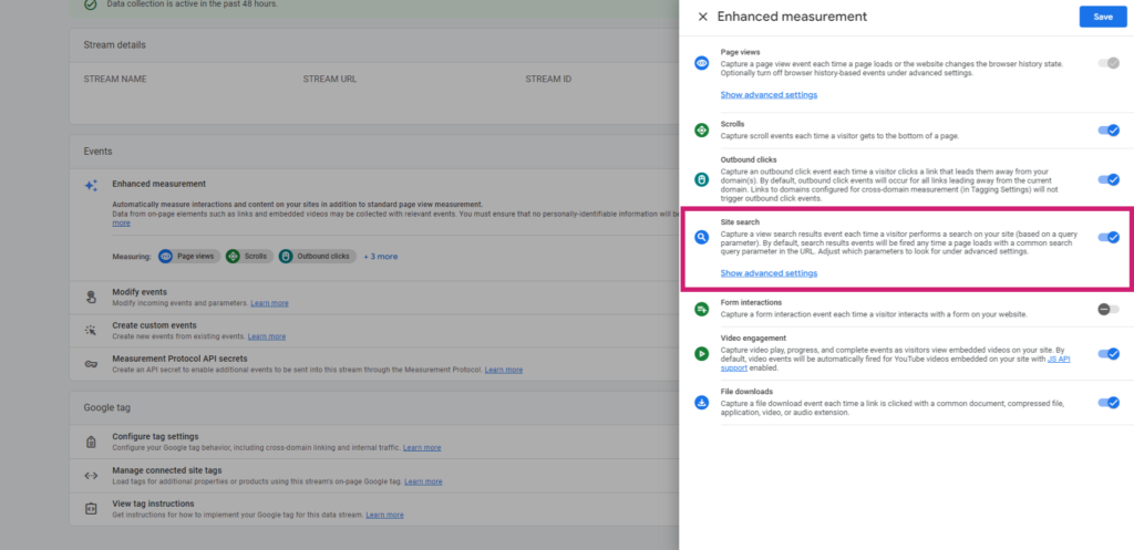 The first step is to enable Site Search in Google Analytics. (Note: these directions are for GA4).